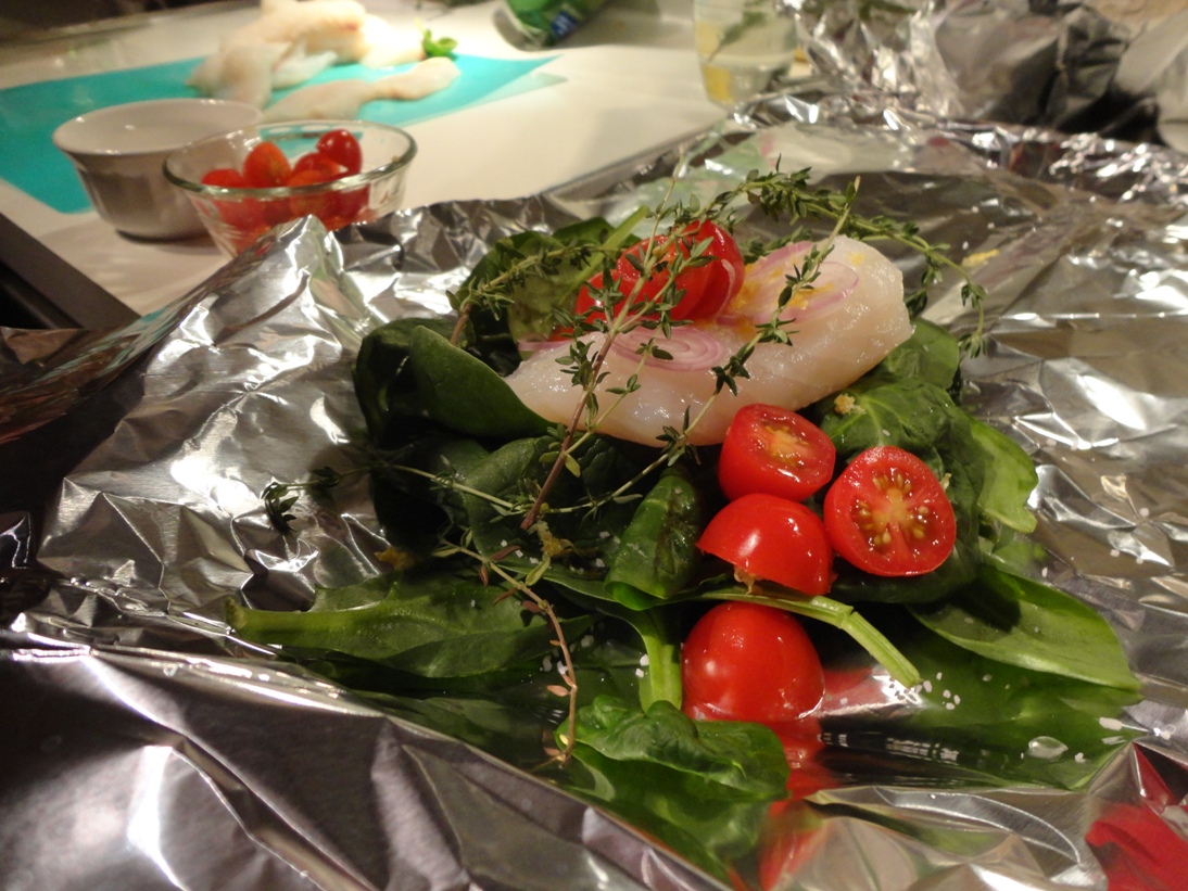 - On top of the foil sheet, lay down a bed of whatever greens you plan to use. The more greens you add, the more sauce you’ll end up with. We used a large handful of baby spinach. Top with the fish. Salt and pepper the fish now, then add whatever other ingredients you plan to put in.