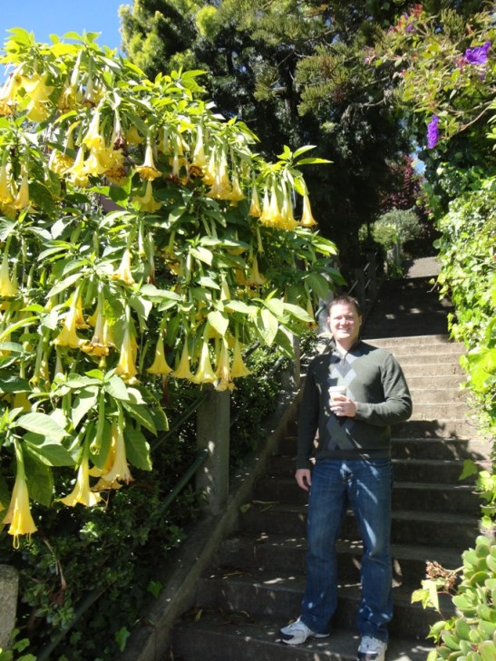 Chad adores Angel’s Trumpets–and I adore him. This was on the climb up to Coit Tower.Admittedly, this photo is only partly shared to showcasing the gardens on the streets of San Francisco. Thank goodness it’s a temperate climate. Imagine if there was ice involved.Lombard Street, of course.Once again, alyssum shows its determination to grow just about anywhere.