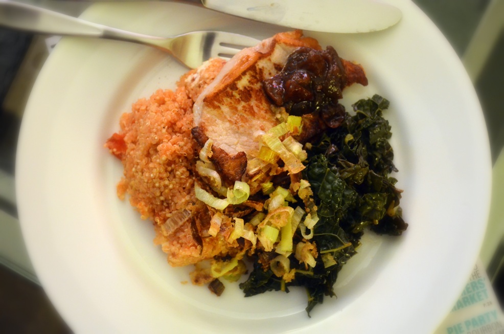 Food I Got My Kitchen Fix Posted by elderjscott on August 27, 2012 Pork loin with homemade pear-onion chutney served alongside braised kale, tomato-feta quinoa topped with crispy leeks Share: Click to share on X (Opens in new window) X Click to share on Facebook (Opens in new window) Facebook Click to share on Pinterest (Opens in new window) Pinterest Click to email a link to a friend (Opens in new window) Email Click to print (Opens in new window) Print Like Loading...