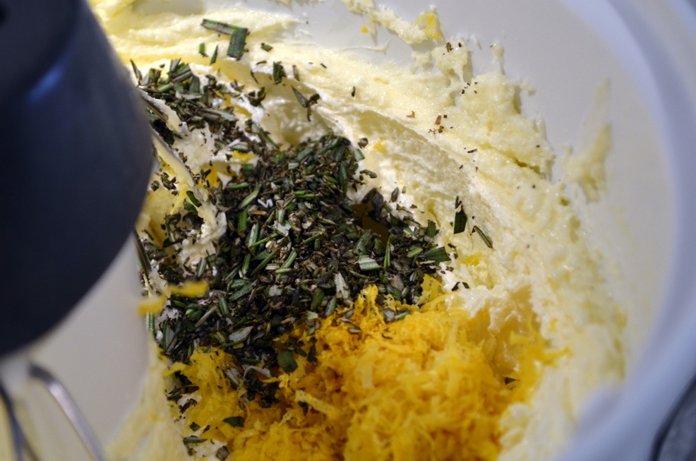 2. Whip butter until creamy, then add sugar, rosemary & lemon zest & whip until creamed together.