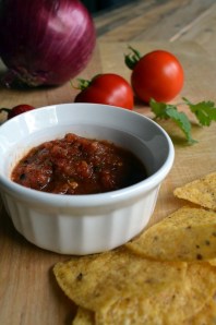 - Finish off the tomato salsa in a similar fashion to the method described above for the tomatillo salsa. Just don’t forget the cumin. Also, if you make it too spicy you can add a bit of vinegar to tame that–not too much and feel free to get creative. I used red wine vinegar for a bit of added flavor.
