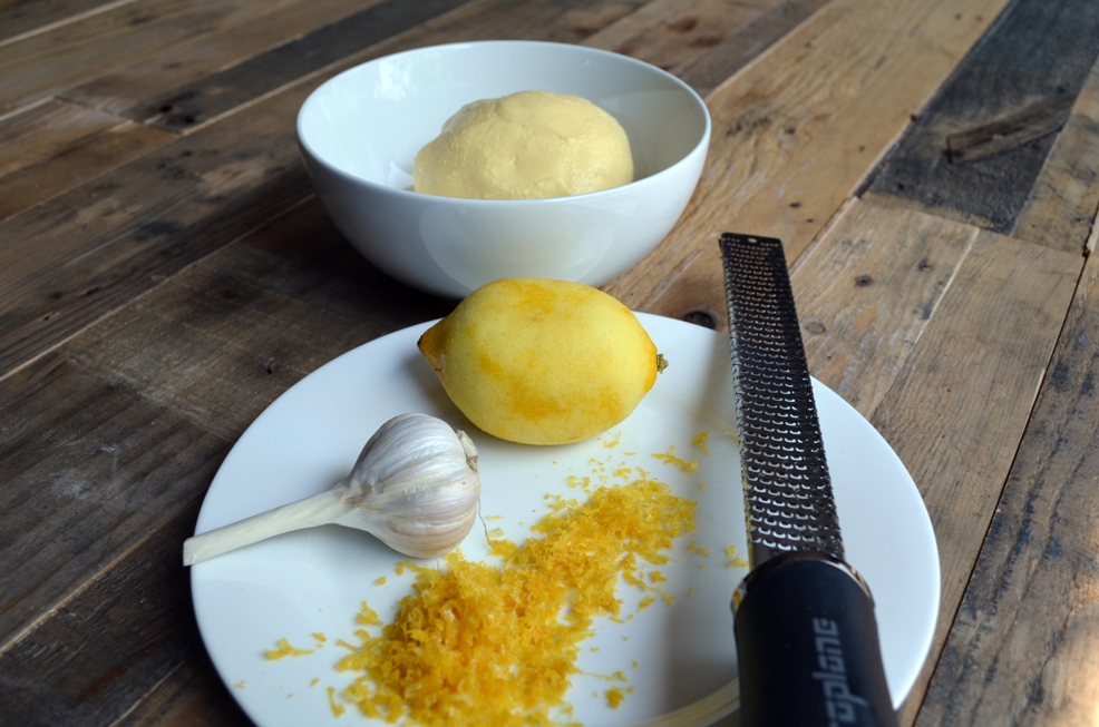 This time, we had some garlic from the Jandy’s Garlic Festival, some lemon zest leftover from the lemon-rosemary sandwich cookiesand plenty of rosemary from our small shrub on the patio. All of these got blended up into a bowl with our freshly-made butter.